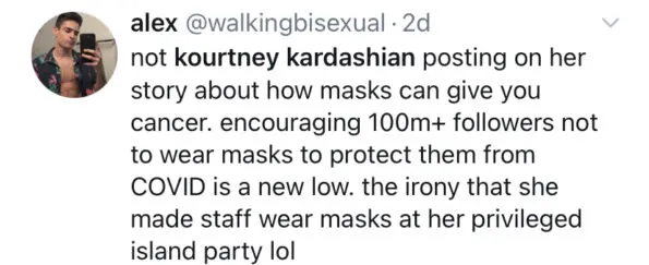 It seems as though the Kardashian/Jenner sisters aren’t catching a break. After both Kim Kardashian West and Kendall Jenner were recently criticized for having birthday parties in the midst of a surging COVID-19 spike, Kourtney Kardashian is now the subject of scrutiny for posting about a mask conspiracy theory.