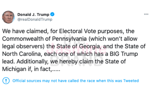 While key states like Pennsylvania and Georgia were still hanging in the balance, Donald Trump hopped on Twitter to claim the victory for them.