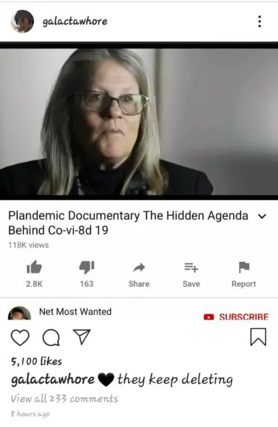 She also posted a screenshot from a YouTube video with the caption “they keep deleting” referring to how some media outlets, including Twitter, have been removing coronavirus-related and 5G-related conspiracy posts: