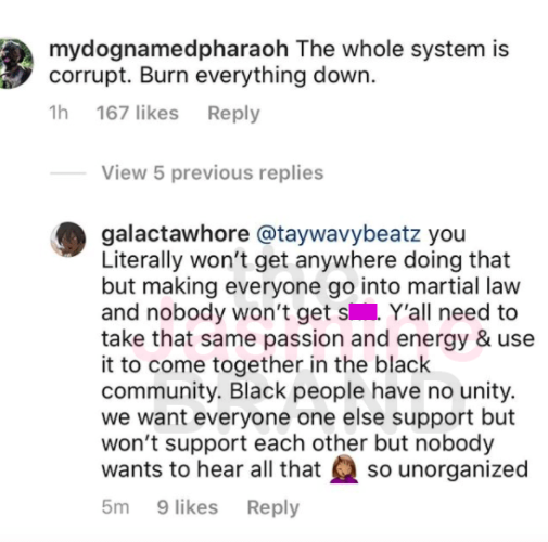 “You literally won’t get anywhere doing that but making everyone go into martial law and nobody won’t get s***. Y’all need to take that same passion and energy & use it to come together in the black community.”