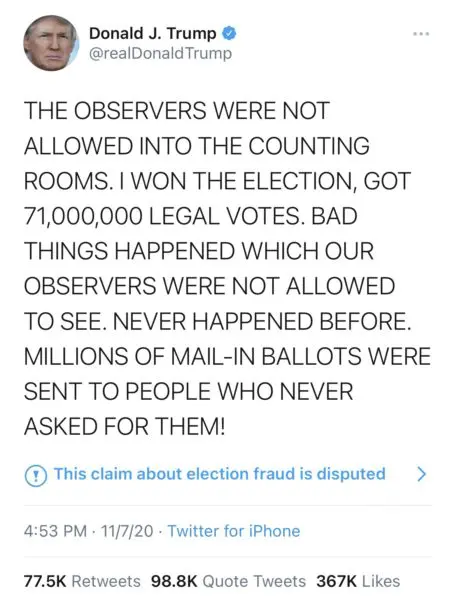 “THE OBSERVERS WERE NOT ALLOWED INTO THE COUNTING ROOMS. I WON THE ELECTION, GOT 71,000,000 LEGAL VOTES. BAD THINGS HAPPENED WHICH OUR OBSERVERS WERE NOT ALLOWED TO SEE. NEVER HAPPENED BEFORE. MILLIONS OF MAIL-IN BALLOTS WERE SENT TO PEOPLE WHO NEVER ASKED FOR THEM!”