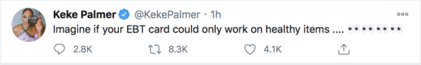 The tweet that seems to have gotten the internet on fire is when Keke Palmer posed a question, imagining if your EBT card could in fact work on all healthy items, even making “healthy food” free. She said: