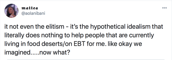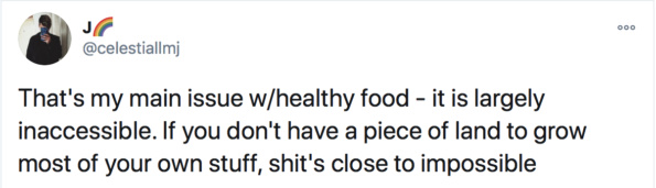 “That’s my main issue w/healthy food – it is largely inaccessible. If you don’t have a piece of land to grow most of your own stuff, shit’s close to impossible.”