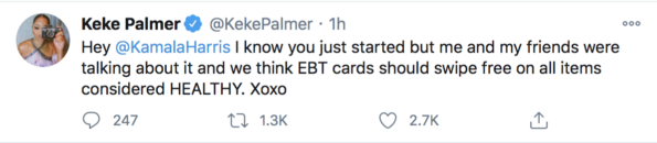 “Hey @KamalaHarris I know you just started but me and my friends were talking about it and we think EBT cards should swipe free on all items considered HEALTHY. Xoxo”