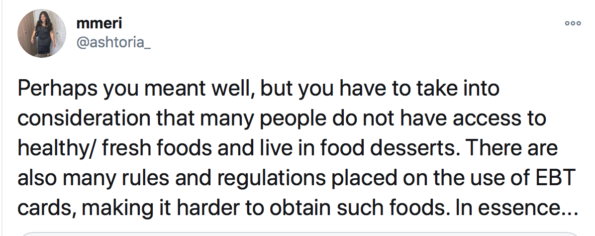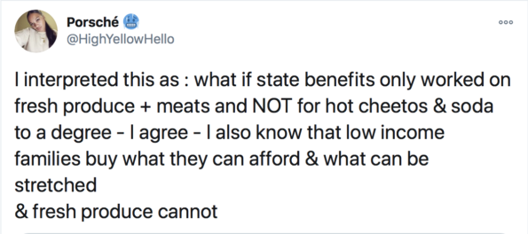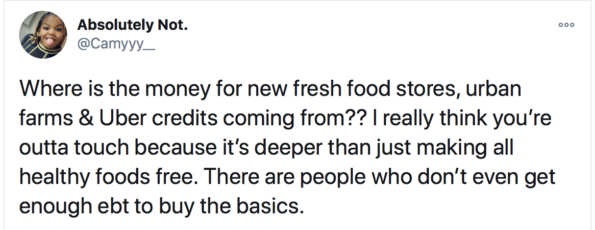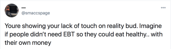 “Hey @KamalaHarris I know you just started but me and my friends were talking about it and we think EBT cards should swipe free on all items considered HEALTHY. Xoxo”