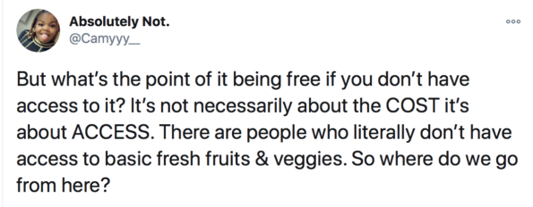 “That’s my main issue w/healthy food – it is largely inaccessible. If you don’t have a piece of land to grow most of your own stuff, shit’s close to impossible.”