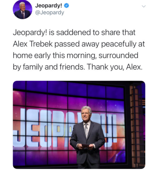 “Jeopardy! is saddened to share that Alex Trebek passed away peacefully at home early this morning, surrounded by family and friends. Thank you, Alex.”
