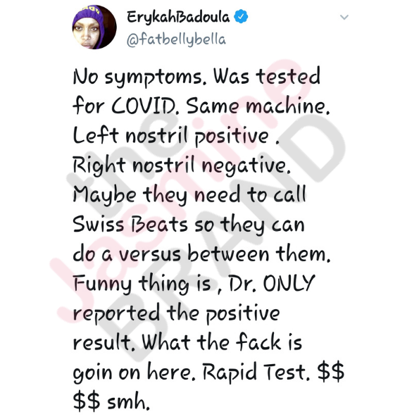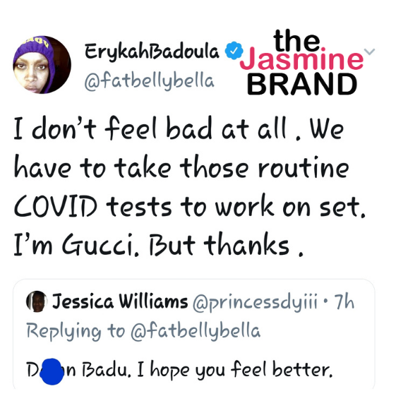 The “Window Seat” singer continued to tweet and responded to fans about her COVID testing experience. Erykah‘s on set working on an unknown project and according to some of her tweets, it was required that everyone was tested for the coronavirus through the method of rapid testing. She added: