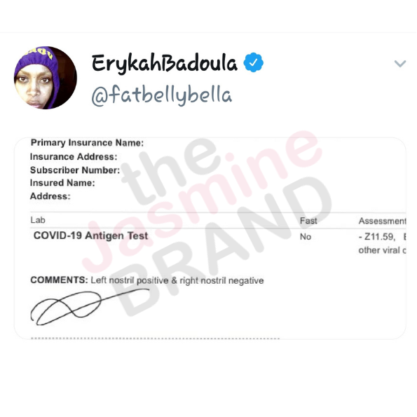 Erykah Badu then posted a tweet showing the official results where her paperwork clearly confirms the strange diagnosis.