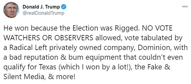 ‘NO VOTE WATCHERS OR OBSERVERS allowed, vote tabulated by a Radical Left privately owned company, Dominion, with a bad reputation & bum equipment that couldn’t even qualify for Texas (which I won by a lot!), the Fake & Silent Media, & more!’