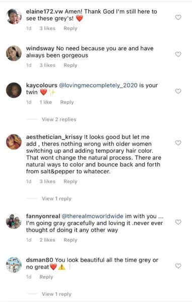 “Hey beautiful sisters. I’ve been asked numerous times why don’t I dye my hair. I WILL NOT. Sisters why are some us afraid to let it happen. I’m going to let the NATURAL PROCESS HAPPEN. I’m enjoying maturing, mentally & physically. I remember when I was younger seeing beautiful older women, that was good being older/wiser. Imma let it happen. I Love Us 4REAL!”