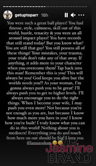 “As your woman, I’m gonna always push you to be great! I’ll always push you to get to higher levels. I’ll always encourage you to do the right things. When I become your wife, I may push you even more! Not because you’re not enough as you are, but because I know how much more you have in you! I know how you’re built! I truly know what you can do in this world! Nothing about you is mediocre! Everything you do and touch from here on out should be big. I love you @lamarodom”