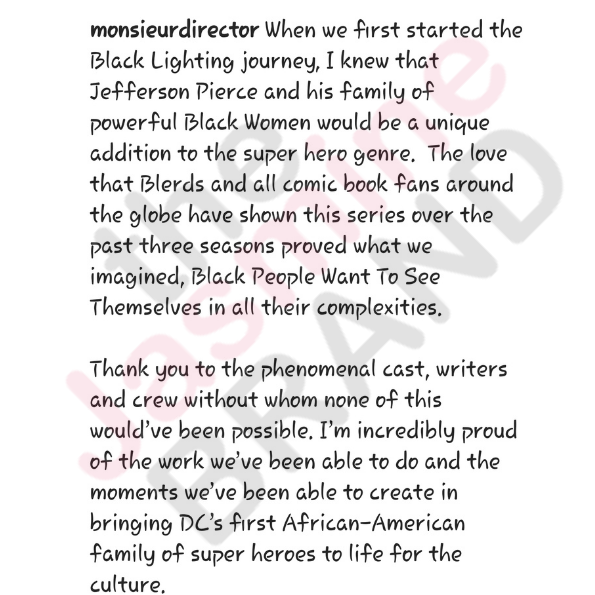 Thank you to the phenomenal cast, writers and crew without whom none of this would’ve been possible. I’m incredibly proud of the work we’ve been able to do and the moments we’ve been able to create in bringing DC’s first African-American family of super heroes to life for the culture.