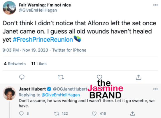 “Don’t think I didn’t notice that Alfonzo left the set once Janet came on. I guess all old wounds haven’t healed yet #FreshPrinceReunion“