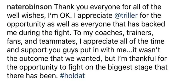 “Thank you everyone for all of the well wishes, I’m OK. I appreciate @triller for the opportunity as well as everyone that has backed me during the fight. To my coaches, trainers, fans, and teammates, I appreciate all of the time and support you guys put in with me…it wasn’t the outcome that we wanted, but I’m thankful for the opportunity to fight on the biggest stage that there has been. #holdat”