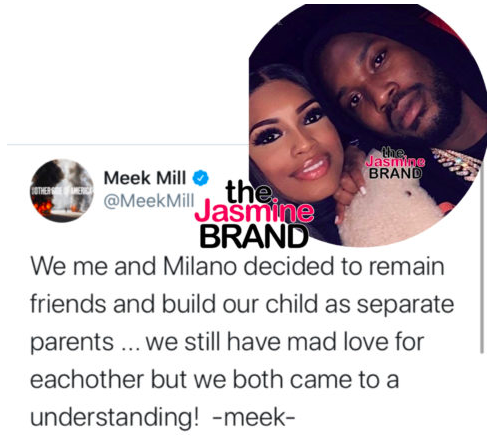 “We me and Milano decided to remain friends and build our child as separate parents … we still have mad love for eachother but we both came to a understanding! -meek-“