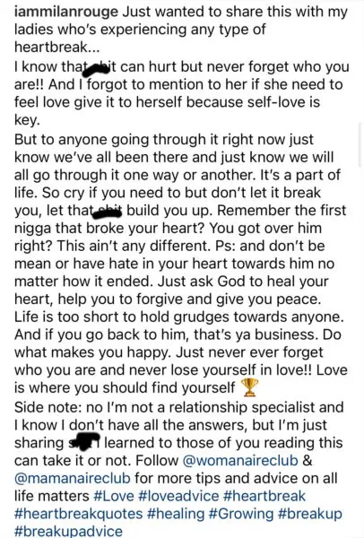 But to anyone going through it right now just know we’ve all been there and just know we will all go through it one way or another. It’s a part of life. So cry if you need to but don’t let it break you, let that sh** build you up. Remember the first nigga that broke your heart? You got over him right? This ain’t any different. Ps: and don’t be mean or have hate in your heart towards him no matter how it ended. Just ask God to heal your heart, help you to forgive and give you peace. Life is too short to hold grudges towards anyone. And if you go back to him, that’s ya business. Do what makes you happy. Just never ever forget who you are and never lose yourself in love!! Love is where you should find yourself…”