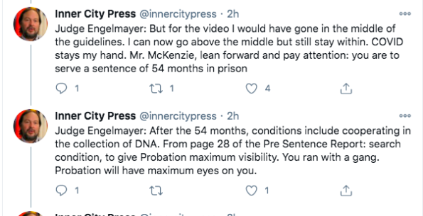“But for the video I would have gone in the middle of the guidelines. I can now go above the middle but still stay within. COVID stays my hand. Mr. McKenzie, lean forward and pay attention: you are to serve a sentence of 54 months in prison.”