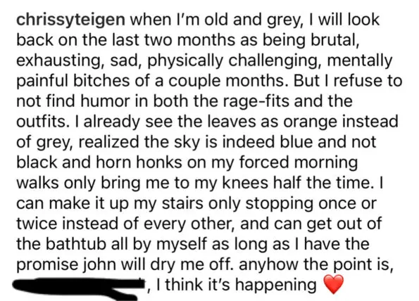 Model, chef and mother Chrissy Teigen opened up to her followers this week about the aftermath of the death of her infant son. The 35-year-old, who shares two kids with singer John Legend, shared on social media: