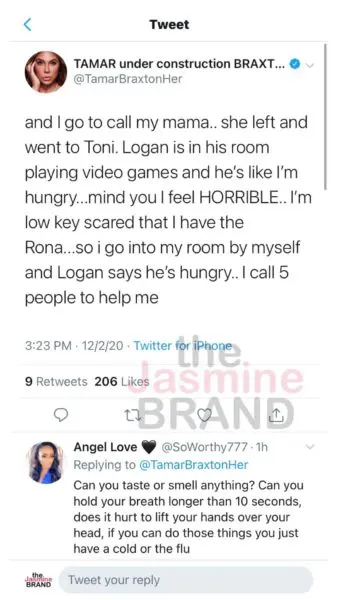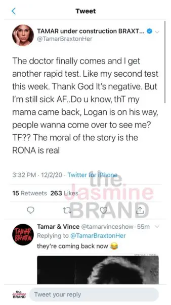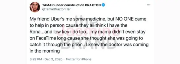 Singe Tamar Braxton took to Twitter to share a coronavirus scare that she had this week, that left her son Logan all alone, and her family keeping their distance from her because they all thought she caught COVID-19.