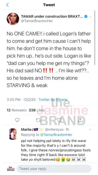 Tamar Braxton says that after calling multiple people to help, Logan’s father and Tamar Braxton’s ex husband Vincent Herbert came to get their son Logan, but he did not want to come inside the house and risk getting sick as well. She added that she was left at home hungry, alone and feeling ill.