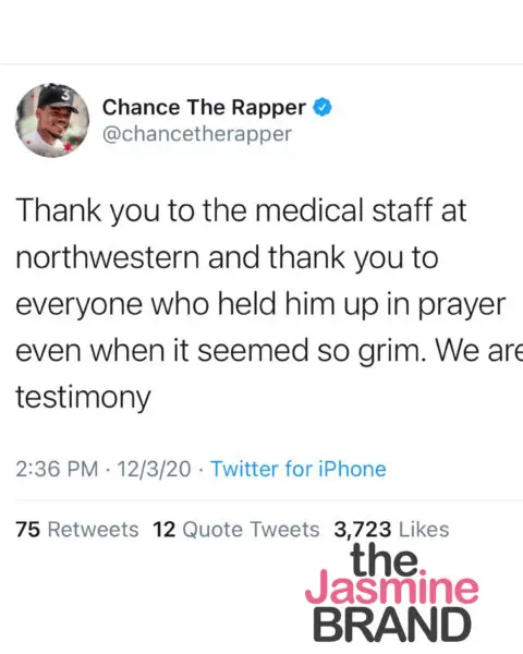 “First and foremost, I would like to thank God and the incredible team of doctors and nurses at Northwestern Memorial Hospital for saving my life. I will be forever grateful. I would also like to thank my family and friends for all their prayers and well wishes. I’m overwhelmed with gratitude. A special thanks to Chance The Rapper, 50 Cent and Diddy for their love and support.”