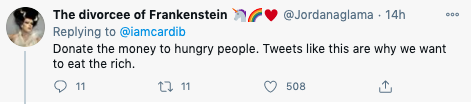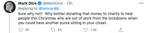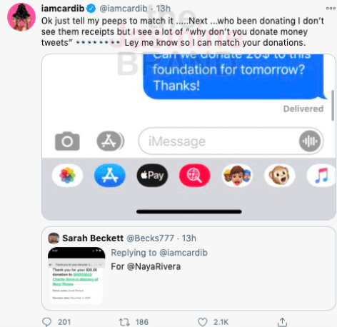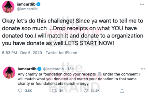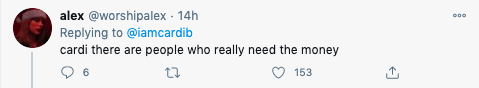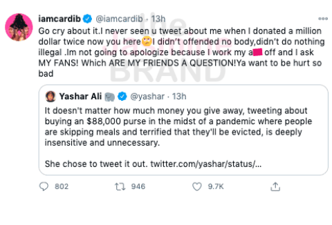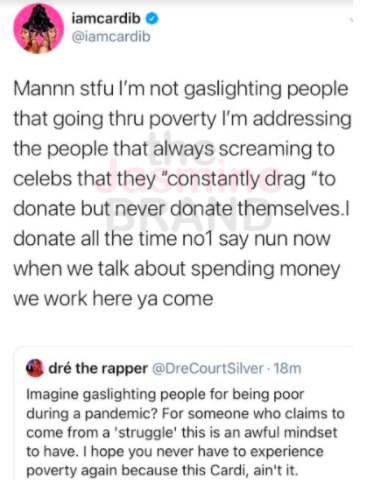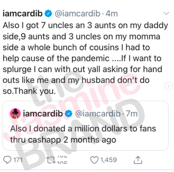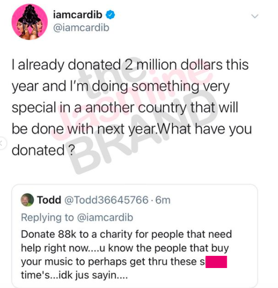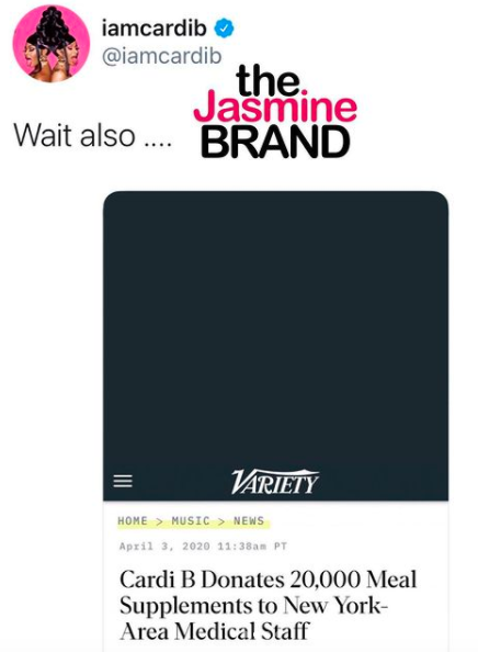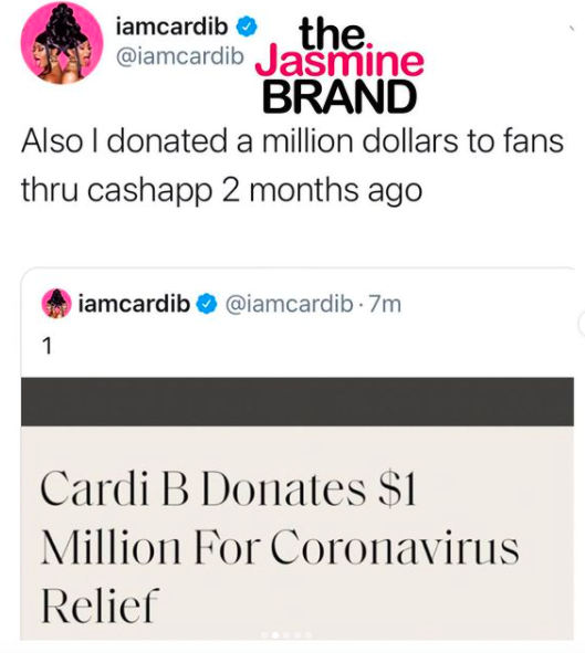 Cardi B responded to the criticism and pointed out that she donated $1 million to coronavirus relief via CashApp and 20,000 meals to medical works in New York.