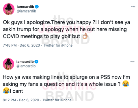 Still, while seemed to have a change of heart and apologized, she questioned why President Donald Trump didn’t receive backlash when he was MIA for COVID-19 meetings and went to play golf instead. She also called out social media users who purchased a PS5, which costs about $500.