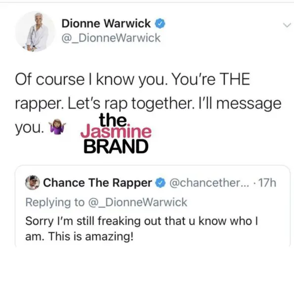 Dionne Warwick’s message to Chance The Rapper turned into a funny exchange between the two. Chance The Rapper replied to Warwick: