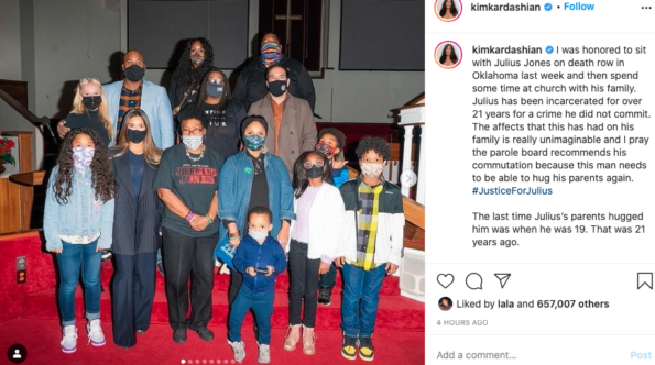 The reality TV star turned soon-to-be lawyer took to Instagram to speak about Julius Jones and her belief that he is an innocent man. Julius has been incarcerated for over 21 years and Kim Kardashian West is now attempting to help set him free.