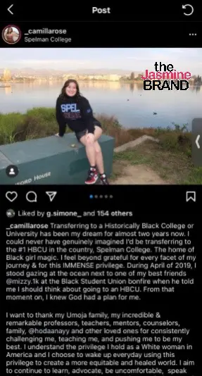 Comments from social media users are in an uproar after a white student named Camilla Rose posted a photo of herself wearing a Spelman sweater with a caption expressing her love for the HBCU. She begins,