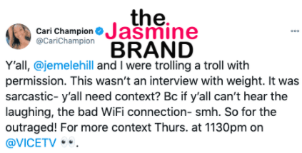 “Y’all, @jemelehill and I were trolling a troll with permission. This wasn’t an interview with weight. It was sarcastic- y’all need context? Bc if y’all can’t hear the laughing, the bad WiFi connection- smh. So for the outraged! For more context Thurs. at 1130pm on @VICETV“
