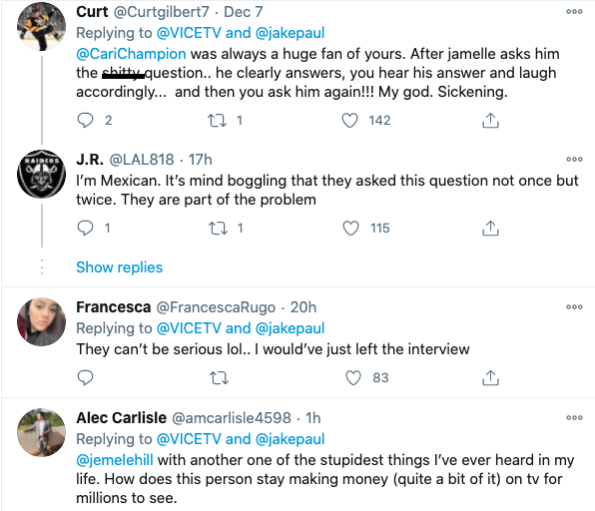 Television journalists Cari Champion and Jemele Hill’s recent comments aren’t sitting well with some fans who were upset about the question they posed to Youtube star Jake Paul. Jake Paul quickly became the center of attention following the much anticipated Mike Tyson vs. Roy Jones, Jr. fight on November 28.