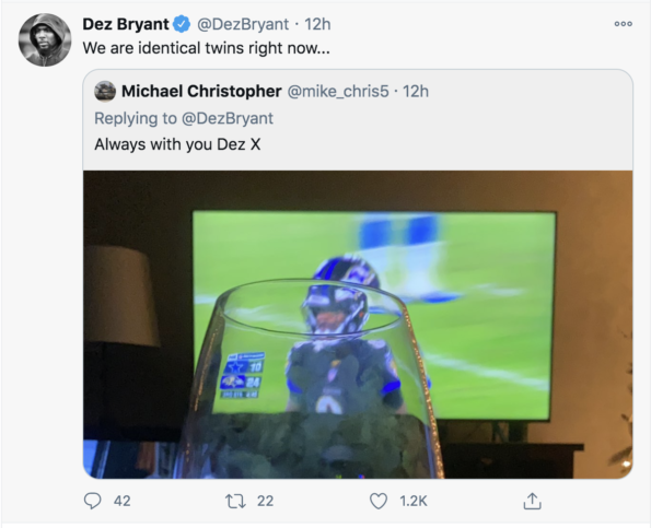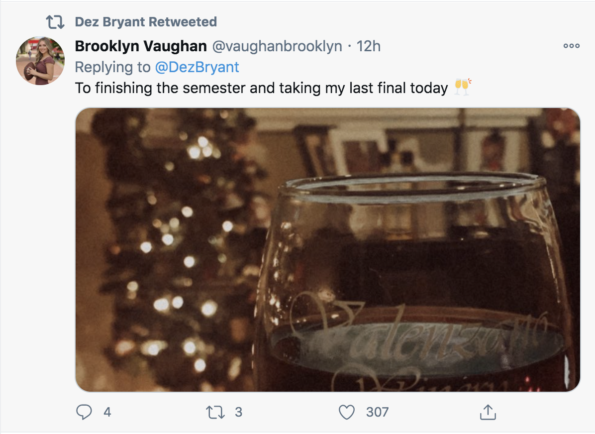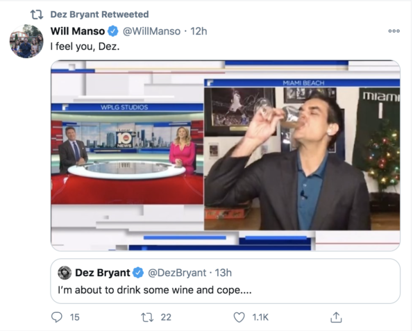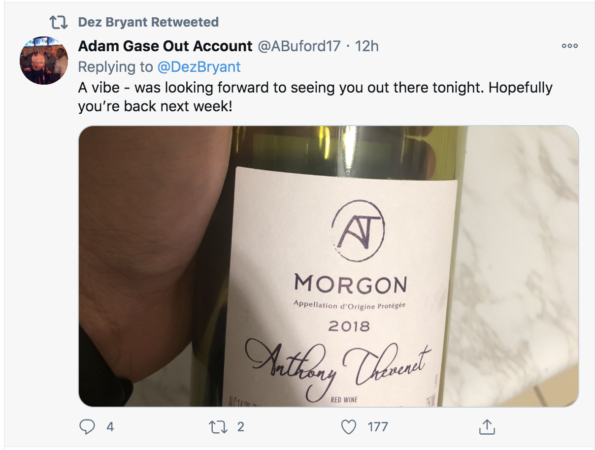 Dez Bryant then says that he was going to cope with the news over a glass of wine.