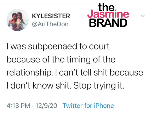 “I was subpoenaed to court because of the timing of the relationship. I can’t tell sh** because I don’t know sh**. Stop trying it.”