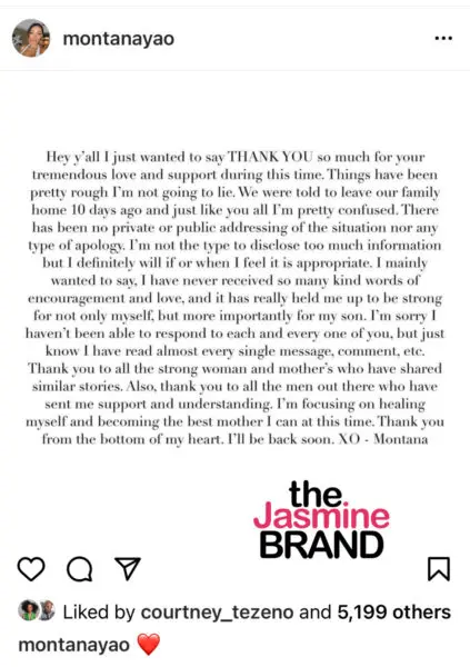 Montana Yao went on to say she doesn’t like to disclose a lot of information, but wanted to thank everyone for their support. She added: