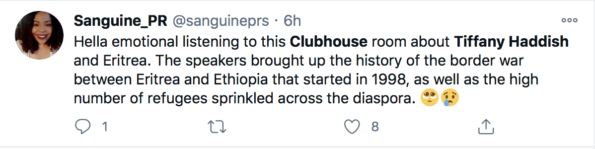 “Hella emotional listening to this Clubhouse room about Tiffany Haddish and Eritrea. The speakers brought up the history of the border war between Eritrea and Ethiopia that started in 1998, as well as the high number of refugees sprinkled across the diaspora.”