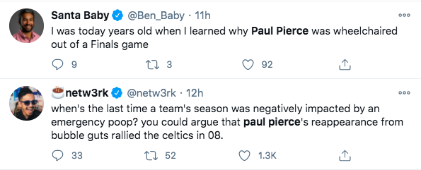 Paul Pierce admitted last year that he was briefly removed from game 1 of the 2008 NBA Finals in a wheelchair because he had to poop and not due to an injury.