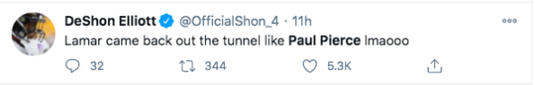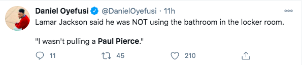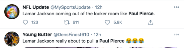 Even though Lamar Jackson has denied taking a bathroom break during his time off the field the damage has already been done. Many fans wasted no time in poking fun at both him and Paul Pierce on Twitter.