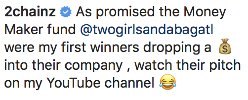 “As promised the Money Maker fund @twogirlsandabagatlwere my first winners dropping a [bag] into their company , watch their pitch on my YouTube channel”