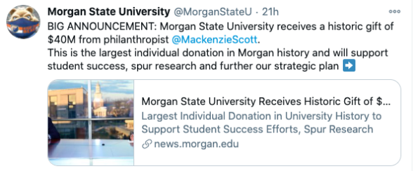 “This monumental gift will change lives and shape futures. I thank Ms. Scott for her due diligence and acknowledgment of the substantive value Morgan offers to so many throughout this nation and around the world, and entrusting that we will ensure the enduring impact of her generosity is truly transformational for many years to come.”