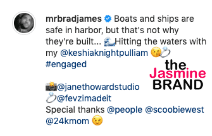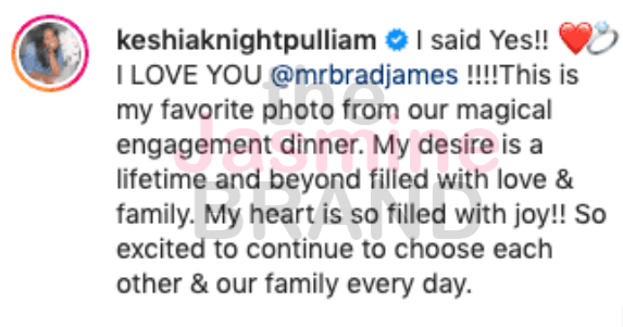 “I said Yes!! I LOVE YOU @mrbradjames !!!!This is my favorite photo from our magical engagement dinner. My desire is a lifetime and beyond filled with love & family. My heart is so filled with joy!! So excited to continue to choose each other & our family every day.”