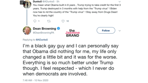 “I’m a black gay guy and I can personally say that Obama did nothing for me, my life only changed a little bit and it was for the worse. Everything is so much better under Trump though. I feel respected – which I never do when democrats are involved.”