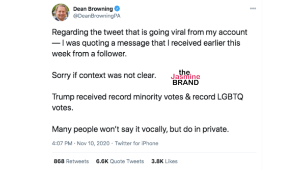 In November, a Twitter account from a profile under Dan Purdy was blasted by Republican politician Dean Browning, who was criticized after reposting what he claims came from a fan in his DMs. The tweet in question stated,