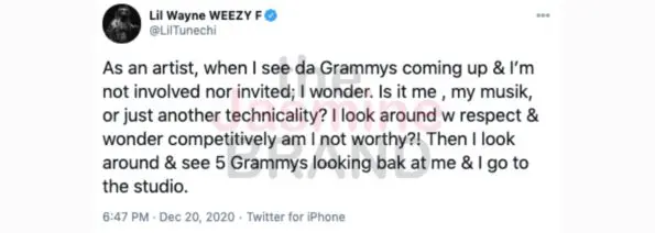 Rapper Lil Wayne says that he feels a certain way when he isn’t invited to the Grammy’s. The rapper took to Twitter to express to his fans that whenever he isn’t invited to the Grammy’s it makes him question if he is worth being there. He writes,