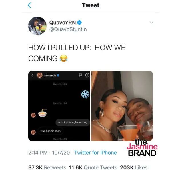 Quavo and Saweetie have quickly become one of the industry’s favorite couples since he introduced himself to her by sliding into her DM in March 2018. In October, Quavo revealed the emoji that he sent to his now-girlfriend that got things started between the two.