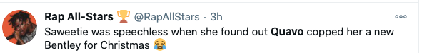 Quavo bought Saweetie a Bentley for Christmas, maybe I do need a glacier boy pic.twitter.com/AcFEGWpFH5