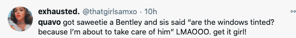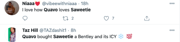 This gift from Quavo comes on the heels of another high priced ticket item that Saweetie copped for herself–a private jet. A video showing the moments of her celebrating after securing the jet was posted online.