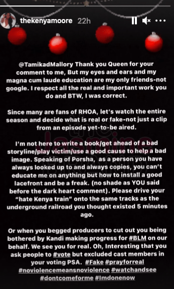 I’m not here to write a book/get ahead of bad storyline/play victim/use a good cause to help a bad image. Speaking of Porsha, as a person you have always looked up to and always copies, you can’t educate me on anything but how to install a lacefront and be a freak. (no shade as YOU said before the dark heart comment). Please drive your “hate Kenya train” onto the same tracks as the underground railroad you thought existed 5 minutes ago.”