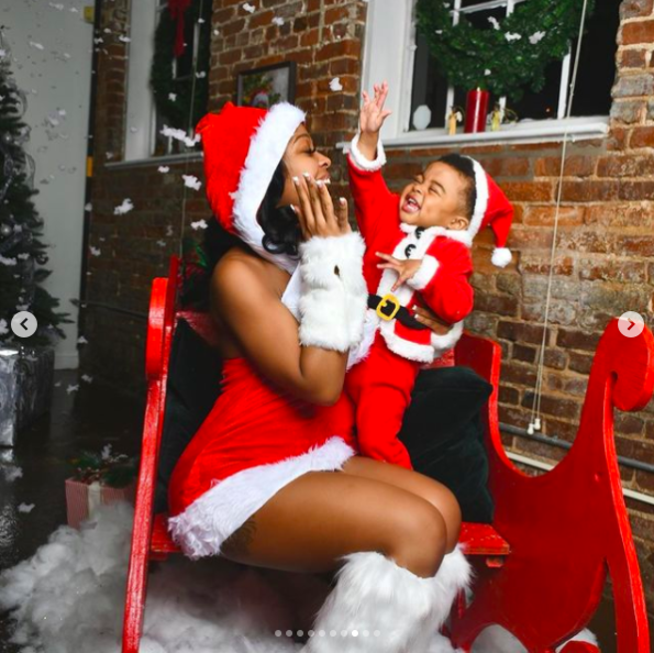 Jayda Cheaves also took her holiday photos with her son. The pair wore similar Santa and Mrs. Clause outfits and seemed to be enjoying themselves on a wooden red slay.